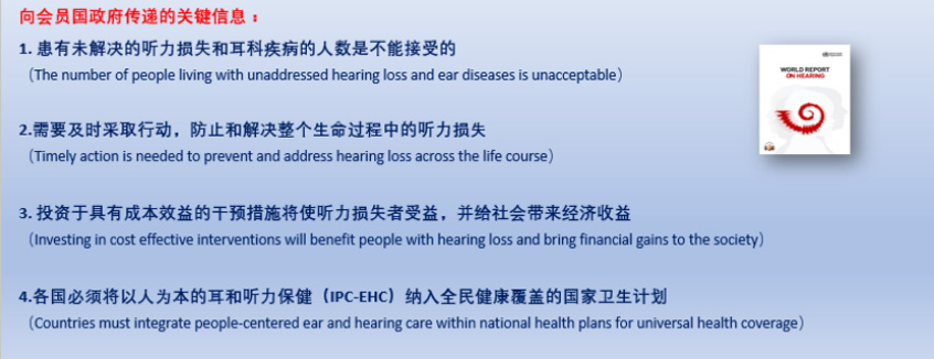 《世界聽力報(bào)告》是根據(jù)2017年《預(yù)防聾和聽力損失決議(WHA70.13)》要求編寫的,以證據(jù)為基礎(chǔ)的政策性文件,于2021年3月3日“世界聽力日”由世衛(wèi)總干事發(fā)布。該文件是政治動(dòng)員和行動(dòng)的工具,也是耳和聽力保健的教育資源,旨在指導(dǎo)會(huì)員國將耳和聽力保健納入國家衛(wèi)生計(jì)劃,人人獲得聽力保?。╤earing care for all)。